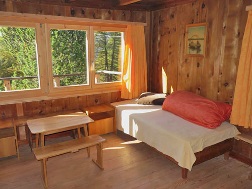| Schlafraum mit 3 Betten im oberen Stock | Kinderbett und Wäscheschrank im oberen Stock |