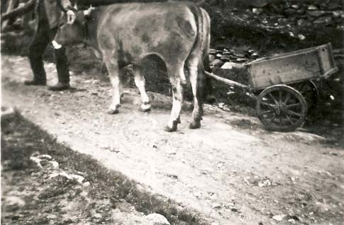 | Tre teara, war auch eine mühsame Arbeit. Hier im Bild zwei Arbeitsgänge: Vorne das Pferd mit dem Mistwagen und dahinter mit den beiden Rindern das Gefährt um die Erde auf den steil abfallenden Äckern von unten wieder nach oben zu transportieren. Die Leute auf dem Bild sind nicht meine Grosseltern, sie besassen kein Pferd. |