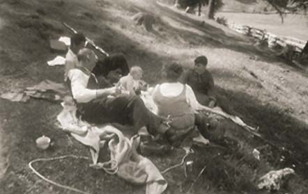 | Heublachen vorbereiten zum hinunterziehen. Ich sitze als 2-jähriger auf einer an der Hand von Elsa, meiner Grossmutter | Heublachen auf Erlenästen einen Abhang hinunterziehen | |